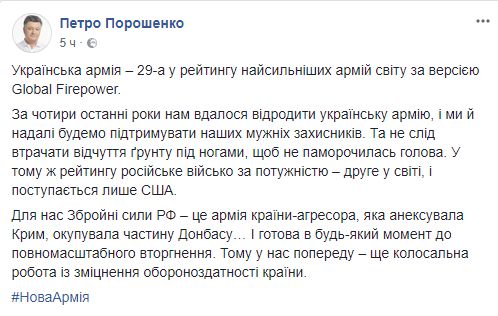 Так, на Facebook Петра Порошенко сегодня есть запись о том, что украинская армия заняла 29-е место в рейтинге Global Firepower.