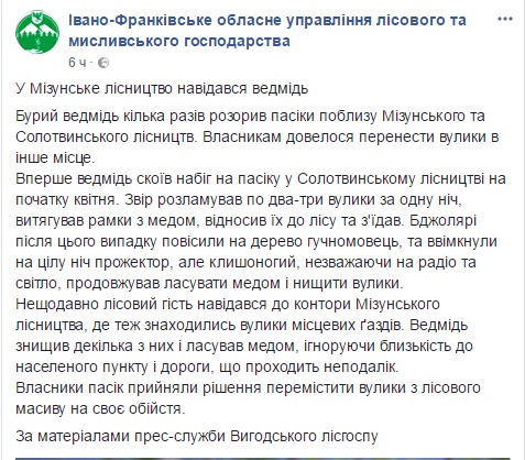"Впервые медведь совершил набег на пасеку в Солотвинском лесничестве в начале апреля. Зверь разламывал по два-три улья за одну ночь, вытаскивал рамки с медом, относил их в лес и съедал. Пчеловоды после этого случая повесили на дерево громкоговоритель, и включили на всю ночь прожектор, но косолапый, несмотря на радио и свет, продолжал лакомиться медом и уничтожать ульи", - говорится в нем.
