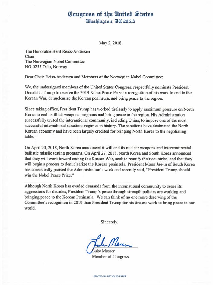 Известно, что письмо к Норвежскому комитету Нобелевской премии в общем подписали 17 конгрессменов. В обращении к комитету американские законодатели отмечают, что президент США Дональд Трамп "без устали давил на Северную Корею, чтобы закончить ее незаконную вооруженную программу и принести мир в регион".