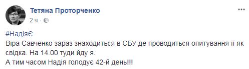 "Вера Савченко сейчас находится в СБУ, где проводится опрос ее как свидетеля. На 14.00 туда иду я", — написала она. Она добавила, что Надежда Савченко голодает уже 42 день.