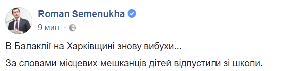 "В Балаклее на Харьковщине снова взрывы. По словам местных жителей, детей отпустили из школы", - написал в Facebook нардеп Роман Семенуха.