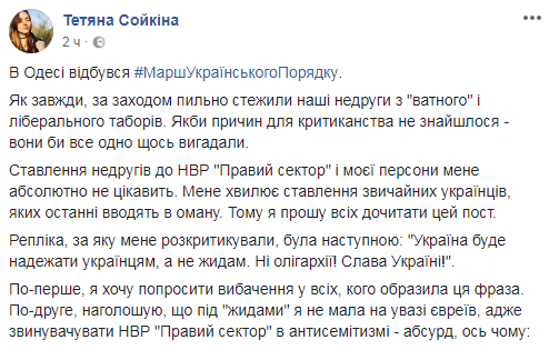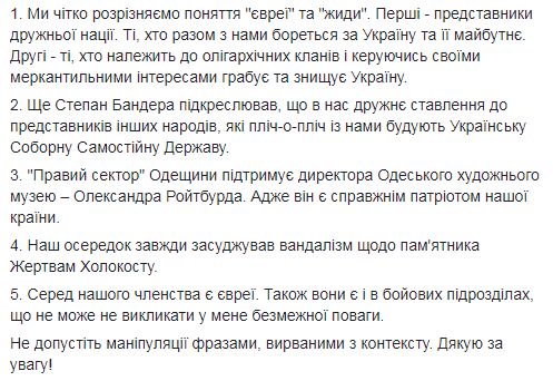 Во-первых, я хочу попросить прощения у всех, кого обидела эта фраза. Во-вторых, подчеркиваю, что под "жидами" я не имела в виду евреев, ведь обвинять НВР "Правый сектор" в антисемитизме - абсурд, вот почему: