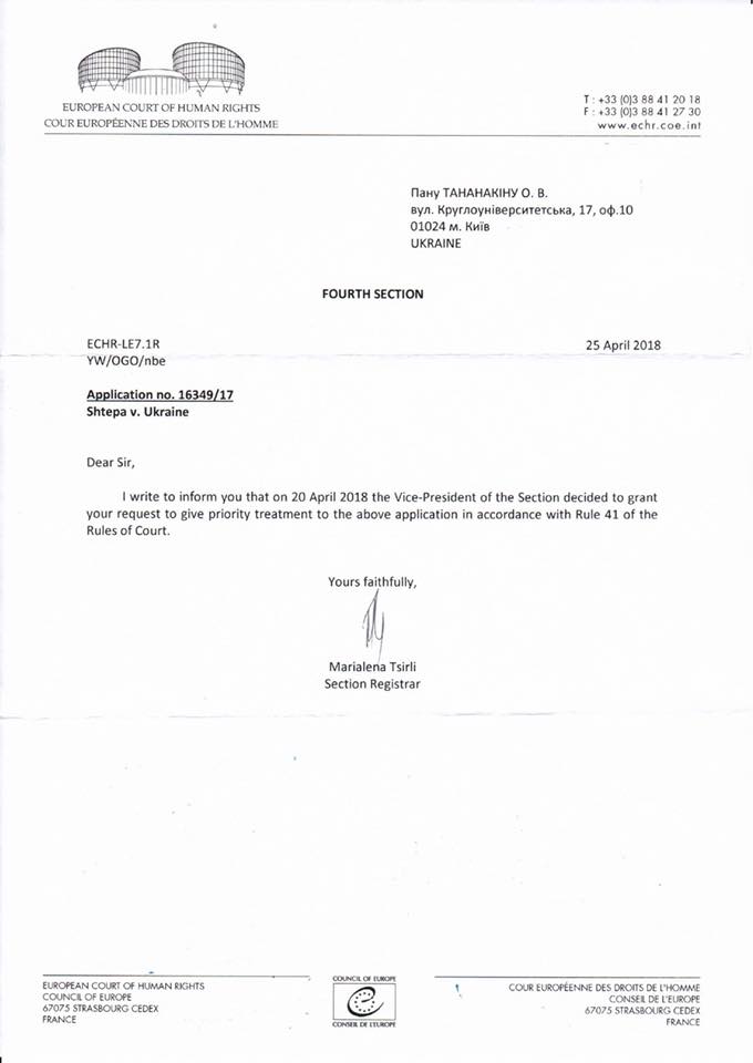 "20 апреля 2018 Европейский суд по правам человека принял решение рассматривать дело экс-мэра города Славянска Нели Штепы в приоритетном порядке", - написал он.