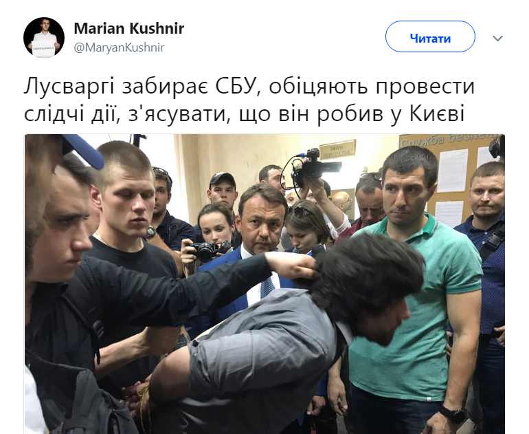 "Лусварги забирает СБУ, обещают провести следственные действия, выяснить, что он делал в Киеве", - написала корреспондент "Радио Свобода" Марьян Кушнир в Twitter.
