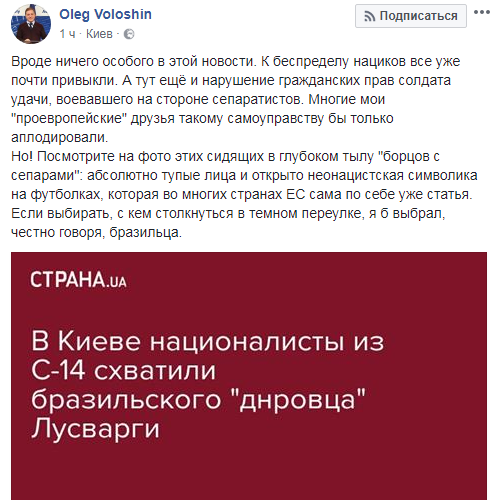 "Вроде ничего особого в этой новости. К беспределу нациков все уже почти привыкли. А тут ещё и нарушение гражданских прав солдата удачи, воевавшего на стороне сепаратистов. Многие мои "проевропейские" друзья такому самоуправству бы только аплодировали.