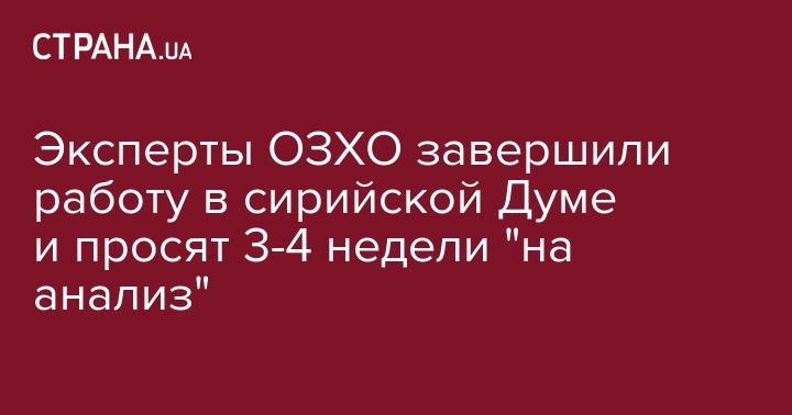 Эксперты международной Организации по запрещению химического оружия (ОЗХО) завершили работу в сирийской Думе. Они взяли пробы с места неподтвержденного химинцидента и доставили их в лабораторию. Анализ образцов займет не менее трех-четырех недель.