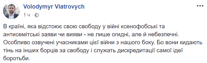 "В стране, которая отстаивает свою свободу в войне, ксенофобские и антисемитские заявления или проявления - не только отвратительны, но и опасны. Особенно озвученные участниками этой войны с нашей стороны. Потому что они бросают тень на других борцов за свободу и служат дискредитации самой идеи борьбы", - написал он в Facebook.