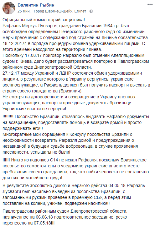"Рафаэль должен был получить паспорт и выехать в страну своего гражданства (Бразилия). Не смотря на договоренности и возвращение в Украину пленных украинских военнослужащих, паспорт и проездные документы бразильцу Украинские власти не вернули", - пишет Рыбин.