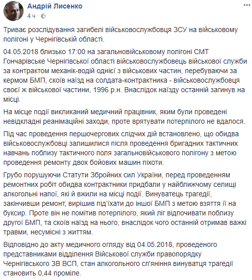 "Около 17.00, 4 мая, на общевойсковом полигоне в поселке Гончаровское Черниговской области военнослужащий военной службы по контракту механик-водитель одной из воинских частей, находясь за рулем БМП, совершил наезд на солдата-контрактника — военнослужащего своей же военной части, 1996 г.р. В результате наезда последний погиб на месте", — рассказал Лысенко.