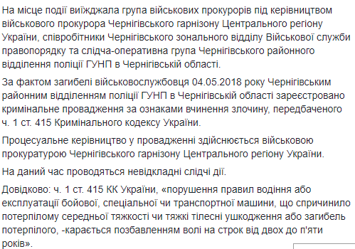 По факту гибели военнослужащего зарегистрировано уголовное производство по признакам совершения преступления, предусмотренного ч. 1 ст. 415 Уголовного кодекса Украины.