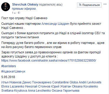 "Сегодня с боями удалось попасть к Надежде в следственный изолятор СБУ и согласовать тактические вопросы. Впереди очень много работы, но мы верим в работу партнера, ведь на его счету много победных дел. Сейчас готовится заявление в правоохранительные органы по факту противодействия адвокату Шадрину в доступе к клиенту", - написал Шевчук.