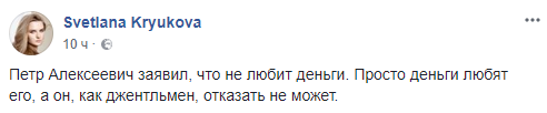 "Петр Алексеевич заявил, что не любит деньги. Просто деньги любят его, а он, как джентльмен, отказать не может", - отметила заместитель главного редактора "Страны" Светлана Крюкова.