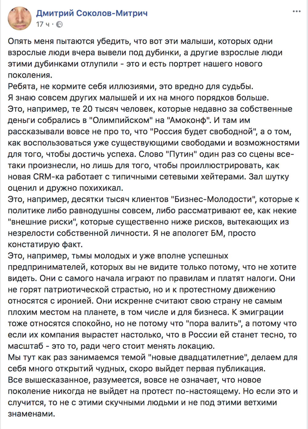 "Опять меня пытаются убедить, что вот эти малыши, которых одни взрослые люди вчера вывели под дубинки, а другие взрослые люди этими дубинками отлупили - это и есть портрет нашего нового поколения, - пишет известный российский журналист, в последние годы ушедший в свой бизнес, Дмитрий Соколов-Митрич. - Ребята, не кормите себя иллюзиями, это вредно для судьбы.