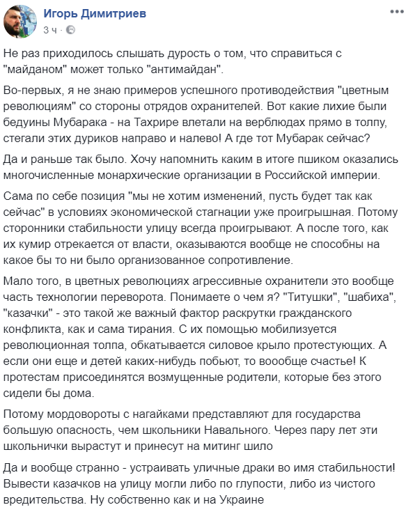 Мало того, в цветных революциях агрессивные охранители это вообще часть технологии переворота. Понимаете о чем я? "Титушки", "шабиха", "казачки" - это такой же важный фактор раскрутки гражданского конфликта, как и сама тирания. С их помощью мобилизуется революционная толпа, обкатывается силовое крыло протестующих. А если они еще и детей каких-нибудь побьют, то воообще счастье! К протестам присоединятся возмущенные родители, которые без этого сидели бы дома.