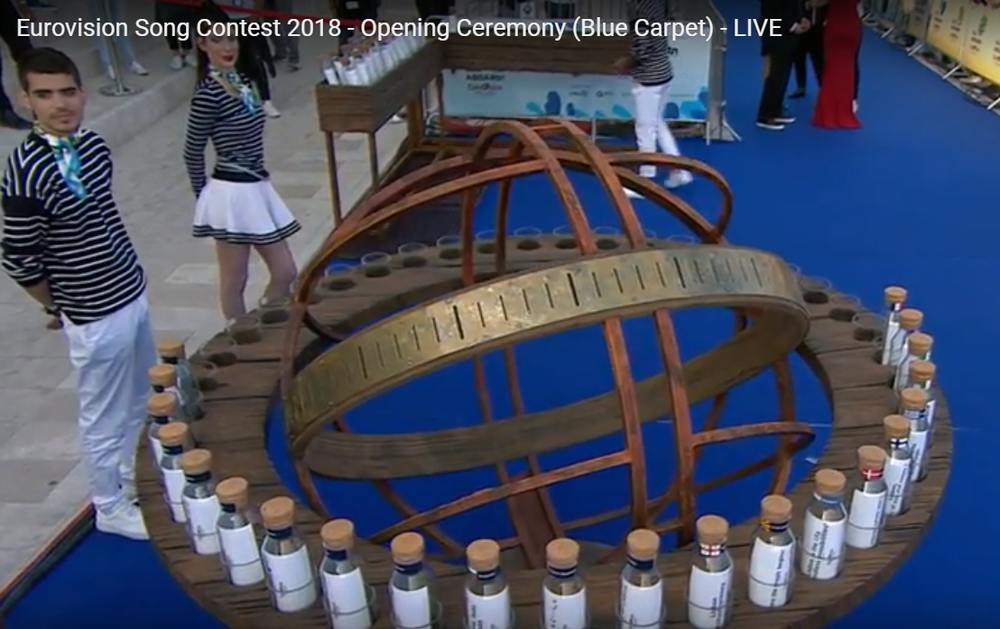 Кстати, отличительной "фишкой" конкурса этого года стала инсталляция в виде огромной планеты, вокруг которой вращаются спутники. На околопланетной орбите находятся уникальные послания в бутылках - флаги каждой страны. Таким образом также обыгрывается тематика океана.