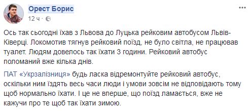 "Вот так сегодня ехал из Львова в Луцк рельсовым автобусом Львов-Киверцы. Локомотив тащил рельсовый поезд, не было света, не работал туалет. Людям пришлось так ехать 3 часа. Рельсовый автобус сломан уже несколько дней", - отметил он.