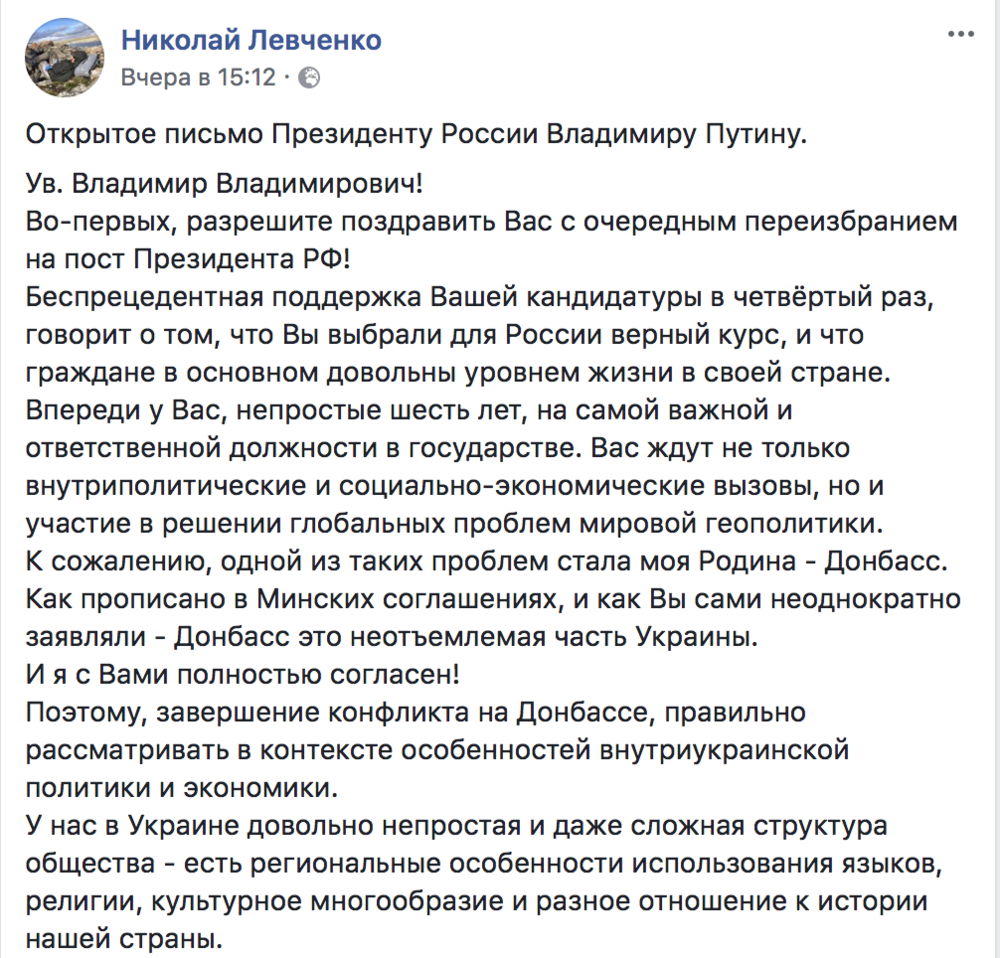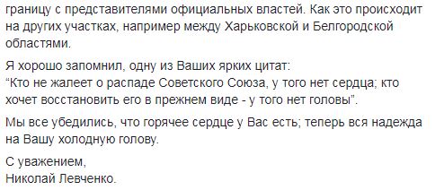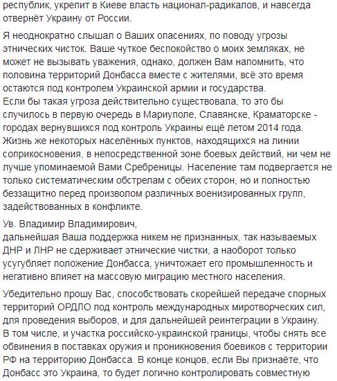 "Ув. Владимир Владимирович, дальнейшая Ваша поддержка никем не признанных, так называемых ДНР и ЛНР не сдерживает этнические чистки, а наоборот только усугубляет положение Донбасса, уничтожает его промышленность и негативно влияет на массовую миграцию местного населения", - написал бывший нардеп.