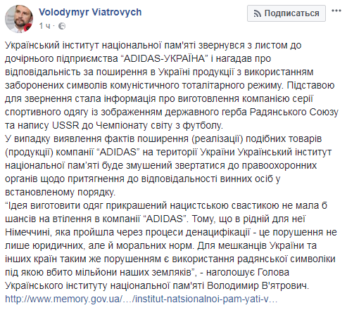 Институт нацпамяти обратился с письмом-жалобой к дочернему предприятию "Adidas-Украина" из-за продажи в Украине продукции с символикой СССР.