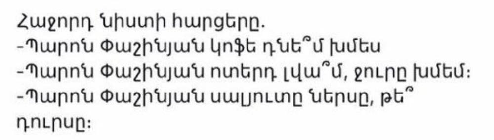 В армянском сегменте Facebook сегодня распространяют мемы о том, какие вопросы будут задавать сегодня. "Вопросы следующего собрания: господин Пашинян, вам кофе поставить? Барон Пашинян, вам помыть ноги и выпить воду? Господин Пашинян, салют делаем внутри или снаружи?".