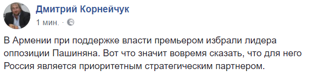 13:15 "В Армении при поддержке власти премьером избрали лидера оппозиции Пашиняна. Вот что значит вовремя сказать, что для него Россия является приоритетным стратегическим партнером", - реагирует на происходящее политолог Дмитрий Корнейчук.