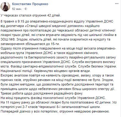"Со станции скорой медицинской помощи" поступило сообщение о госпитализации в Черкасскую областную детскую клиническую больницу трех детей, которые стали терять сознание во время школьной линейки в ООШ №8. Впоследствии, количество детей, которые начали жаловаться на тошноту и головокружение, увеличилось до 15-ти", - написал он.