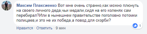 "Вот мне очень странно,как можно плюнуть на своего личного деда, чьи медали, сидя на его коленях сам перебирал? Или в нынешнем правительстве поголовно потомки полицаев, и это не их победа, а повод для скорби?", - спрашивает Максим Плаксиенко.