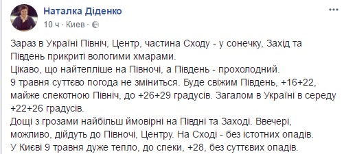 "Сейчас в Украине на севере, в центре, на часть Востока - солнышко, Запад и Юг прикрыты влажными облаками. Интересно, что самый теплый сейчас север, а юг - прохладный. 9 мая существенно погода не изменится. Будет свежим Юг, + 16 + 22, почти жарким Север, до + 26 + 29 градусов. Вообще в Украине в среду + 22 + 26 градусов. Дожди с грозами наиболее вероятные на Юге и Западе. Вечером, возможно, придут на Север и в Центр. На Востоке - без существенных осадков. В Киеве 9 мая очень тепло, до жары, +28, без осадков", - написала она.
