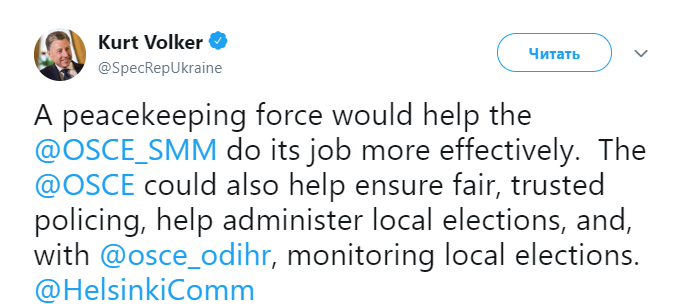 Волкер добавил, что присутствие миротворцев ООН поможет ОБСЕ более эффективно выполнять свою работу, а также даст возможность миссии обеспечить справедливое, надежное поддержание порядка, помочь в проведении и мониторинге местных выборов".