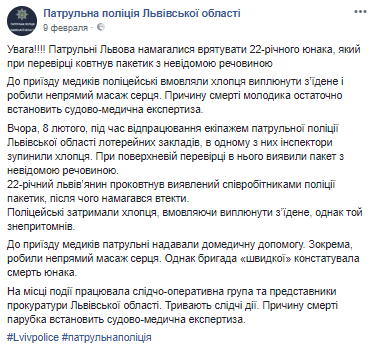 22-летний львовянин быстро положил его в рот и попытался уйти. Патрульные задержали его и уговаривали выплюнуть пакет, однако парень проглотил его. Все попытки достать посторонний предмет оказались неудачными. Парень потерял сознание. Инспекторы вызвали "скорую" и начали оказывать домедицинскую помощь, но спасти ему жизнь не удалось.
