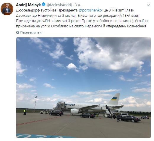 "Дюссельдорф встречает Президента Порошенко: это 3-й визит главы государства в Германии за 3 месяца! Более того, это рекордный 13-й визит Президента в ФРГ за прошедшие 3 года! Однако в суеверия не верим :) Украина обречена на успех! Особенно на праздник Победы и в канун Вознесения", - написал Мельник.