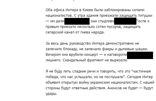 "Сегодня, 9 Мая, правые из Нацкорпуса начали блокирование телеканала Интер. Причина — опубликованный в инете фрагмент концерта под названием "День Победы", где ведущие Интера говорят о том, что сейчас "улицы украинских городов называют в честь фашистских преступников". Они имеют ввиду Бандеру, Шухевича, Коновальца и т.д, - говорится в сообщении на телеграм-канале Нацкорпуса. - Сегодня Интер объявил открытую войну украинским националистам. С нашей стороны будут ответные действия. Анонсов не будет - будут удары".