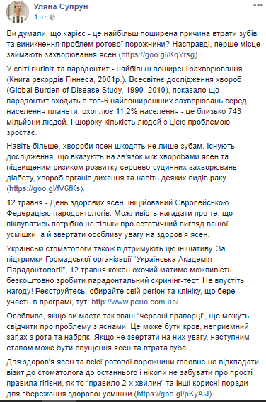 В своем посте глава МОЗ сослалась на исследования, указывающие на связь между болезнями десен и повышенным риском развития сердечно-сосудистых заболеваний, диабета, болезней органов дыхания и даже некоторых видов рака.