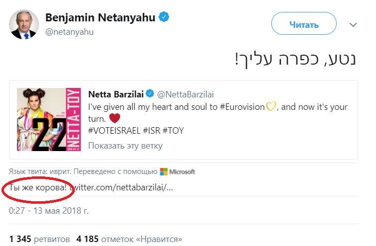 12.25 "Я думал, это шутка такая. Проверил. Оказывается, Твиттер "с помощью Microsoft" поздравление победительнице Евровидения от Нетаньяху действительно перевел "Ты же корова!" - пишет политолог Владимир Корнилов у себя в Facebook.