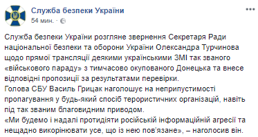 В сообщении говорится о том, что глава спецслужбы Василий Грицак подчеркивает "недопустимость какой-либо пропаганды террористических организаций, даже под так называемым благовидным предлогом".