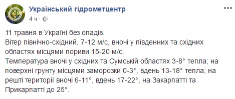 "Заморозки обещают в Сумской, Харьковской, Луганской и Донецкой областях заморозки на поверхности почвы местами 0-3°, Такая температура опасна для вегетирующих растений", - говорится в сообщении.