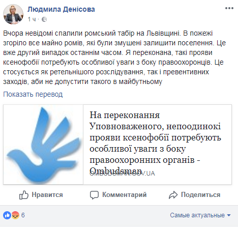 "Вчера неизвестные сожгли цыганский табор на Львовщине. В пожаре сгорело все имущество цыган, были вынуждены покинуть поселение", - написала Денисова в четверг, 10 мая.