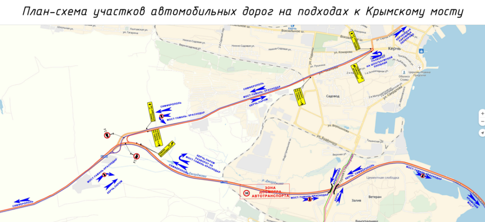 В четверг, 10 мая опубликована план-схема движения легковых автомобилей и автобусов на подъездах к автодорожной части транспортного перехода через Керченский пролив. Его открытие запланировано во второй половине месяца.