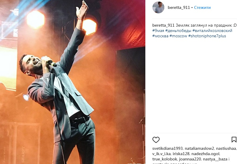 Украинский певец Виталий Козловский 9 мая выступил в Москве. Концерт состоялся в московском районе Солнцево, на нем также выступали Надежда Бабкина и Диана Гурцкая.