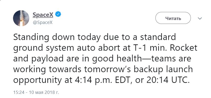 Об этом говорится в сообщении SpaceX в Twitter.