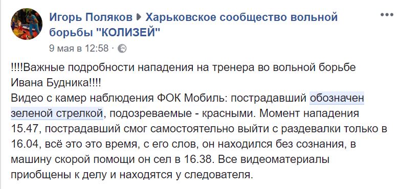 В группе харьковского сообщества вольной борьбы появилось видео избиения. Запись выложил в соцсети харьковский спортсмен Игорь Поляков.