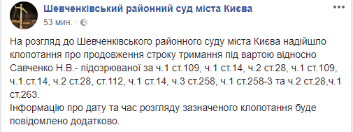 "На рассмотрение в Шевченковский районный суд города Киева поступило ходатайство о продлении срока содержания под стражей в отношении Савченко Н.В.", - говорится в сообщении.