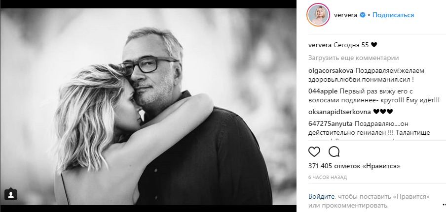 Знаменитости исполняется 55 лет. По случаю дня рождения мужа певица Вера Брежнева поздравила его в соцсети черно-белым совместным фото и лаконично сопроводила ее подписью: "Сегодня 55" и сердечком.
