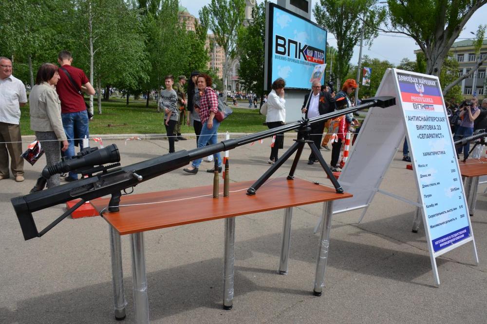 А 9 мая в центре столицы Донбасса появилась еще одна снайперка - "Сепаратист". Это огромная крупнокалиберная винтовка на подставке. Кроме нее на выставке оружия засветилось несколько доморощенных донецких минометов.