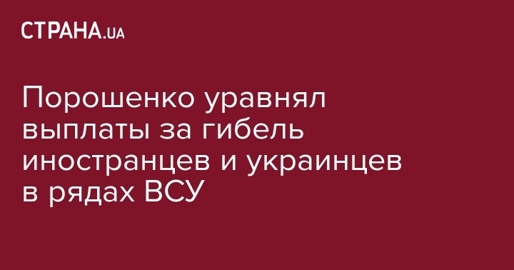 Президент Петр Порошенко уравнял денежные выплаты за гибель иностранцев и украинцев в рядах армии.