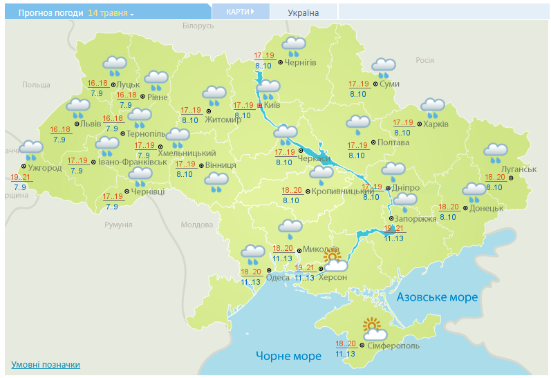 Во вторник, 15 мая, в Украине также продлится дождливая погода с грозами. Ливни пройдут в основном в западных и восточных регионах.