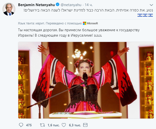 "Нетта, вы принесли много уважения государству Израиль! В следующем году в Иерусалиме", - сказано в сообщении.
