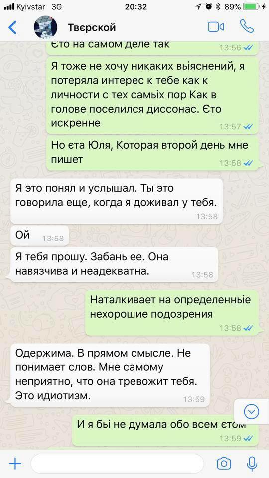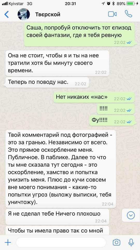 Также она опубликовала на своей странице в Facebook скрины личных переписок Ольги Миколюк с Тверским и выписки с его банковской карты.