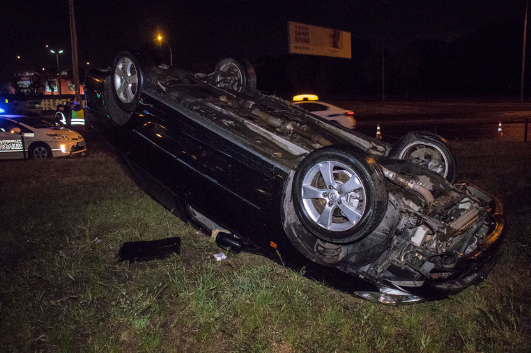 Ночью на проспекте Героев Сталинграда в Киеве Toyota вылетела на зеленую зону у дороги и перевернулась.