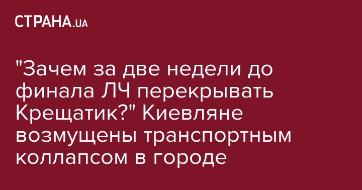 Но главная причина в том, что столичные власти до 30 мая перекрыли движение транспорта на участке Крещатика от ул. Городецкого до ул. Богдана Хмельницкого – типа готовится фан-зона для болельщиков Лиги чемпионов. Причем сделали это зачем-то еще за две недели до финала ЛЧ, который, как известно, состоится 26 мая. К слову, ближе к этой дате будет запрещено или ограничено движение транспорта на отдельных участках улично-дорожной сети города в 1,5-километровой зоне вокруг НСК "Олимпийский".