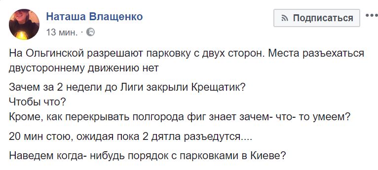 Возмущена пробками в столице и генпродюсер телеканала ZIK Наталья Влащенко. "Зачем за две недели до Лиги перекрыли Крещатик?" – вопрошает она.